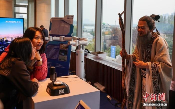 观众与交互型仿生人形机器人孔子互动。