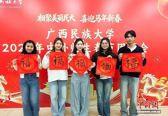 团拜会上,师生们共进“团圆饭”,校方还为学子们准备了内含传统年货与吉祥物的新春礼包。广西民族大学党委书记唐平秋表示,学校举办此次活动,旨在搭建一座跨越地域、连接文明的桥梁,希望学子们互学互鉴、增进友谊,成为连接中国与世界的友好使者。(完)