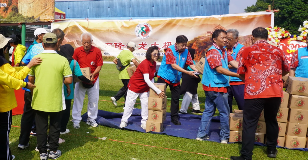 东朋饭并分给嘉宾们,大家开心地享用。庆祝间隙,由太极组长们分发300份内装生活必需品包裹