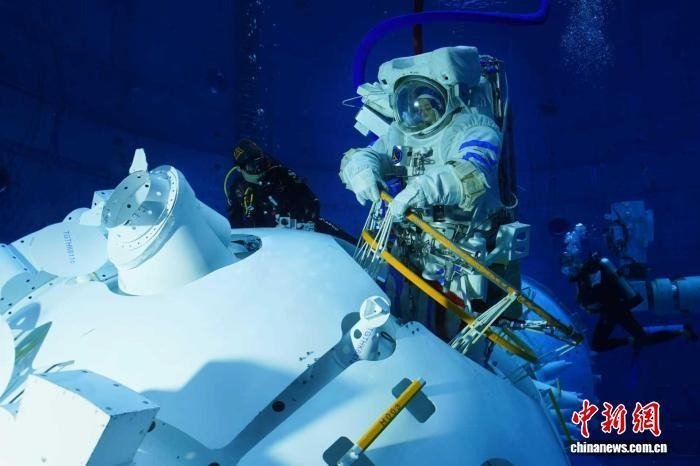 王亚平在水下进行出舱训练。