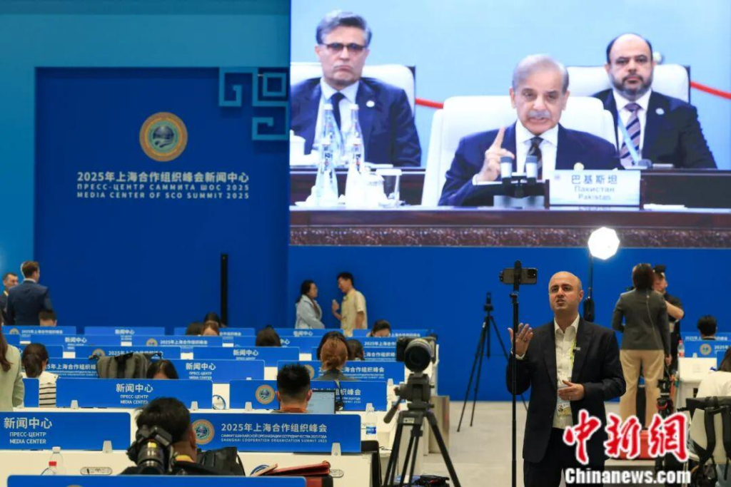 2025年9月1日,天津,外国记者在2025年上海合作组织峰会新闻中心进行直播。