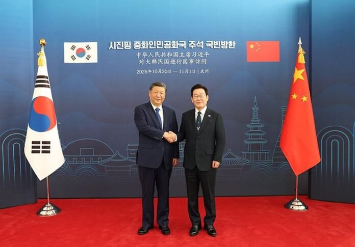 当地时间11月1日下午,韩国总统李在明同中国国家主席习近平在庆州博物馆举行会谈。