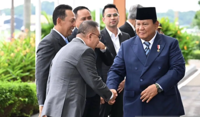 在登上印尼鹰航1号航班(PK-GIG)之前,普拉博沃总统在停机坪上与前来送行的国家官员们进行了交谈。内阁秘书处发布的照片显示,普拉博沃总统面向国家警察总长,右边是众议院副议长苏夫米·达斯科,左边是副总统吉布兰。