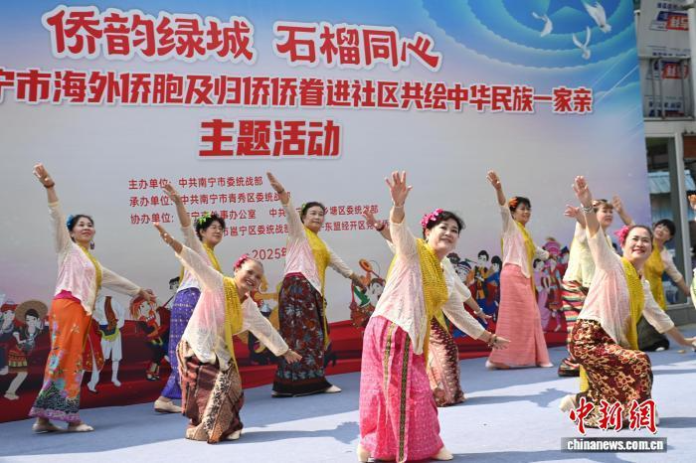 当天上午,广西南宁市“侨韵绿城石榴同心——海外侨胞及归侨侨眷进社区共绘中华民族一家亲”主题活动在该市南湖小区社区“侨家小苑”举行。李雅芬带领的26人归侨文艺队,以一支热情洋溢的印尼风情舞蹈赢得全场阵阵掌声。