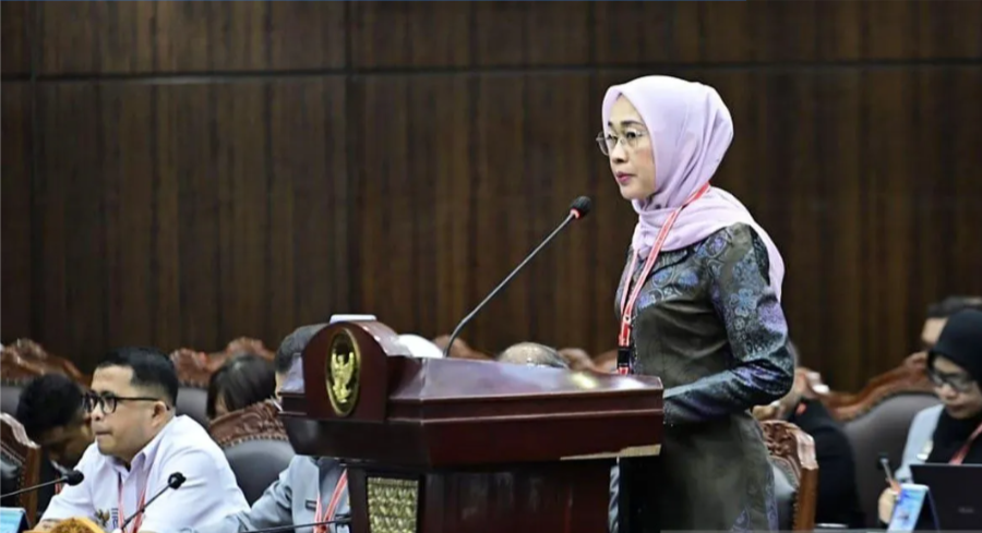 安吉娅周一在雅加达宪法法院全体法庭举行的《国有企业法》若干条款司法审查后续听证会上作