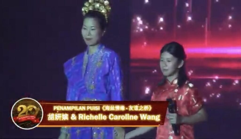 来自河南开封的外派教师,带领印尼学生朗诵了诗歌《海丝情缘 友谊之桥》。这首诗歌主要表达了中国和印尼友谊之树根深叶茂、未来携手共赴的美好主题,赢得了现场观众的喜爱与热烈掌声。