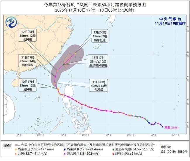(中国天气网讯 )中央气象台11月10日18时继续发布台风黄色预警:今年第26号台风“凤凰”的中心今天(10日)下午5点钟位于台湾岛鹅銮鼻南偏西方约500公里的南海中东部海面上,就是北纬17.9度、东经118.7度,中心附近最大风力有12级(35米/秒),中心最低气压为970百帕,七级风圈半径380-480公里,十级风圈半径180-220公里,十二级风圈半径80公里。
