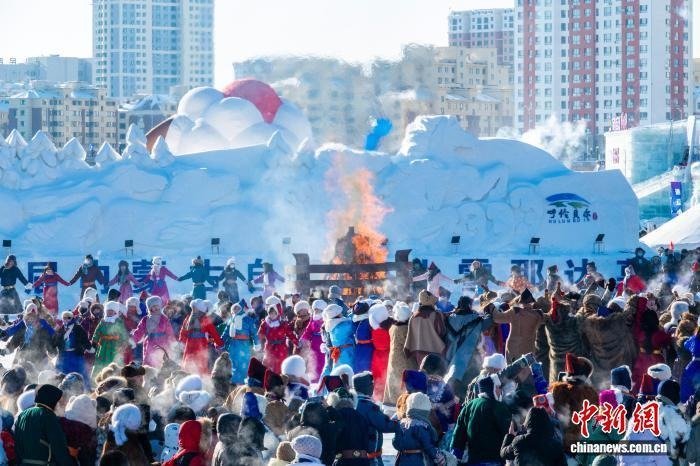 2025年12月21日,内蒙古呼伦贝尔,冰雪那达慕现场举行祭火仪式