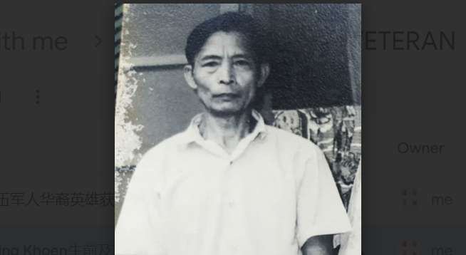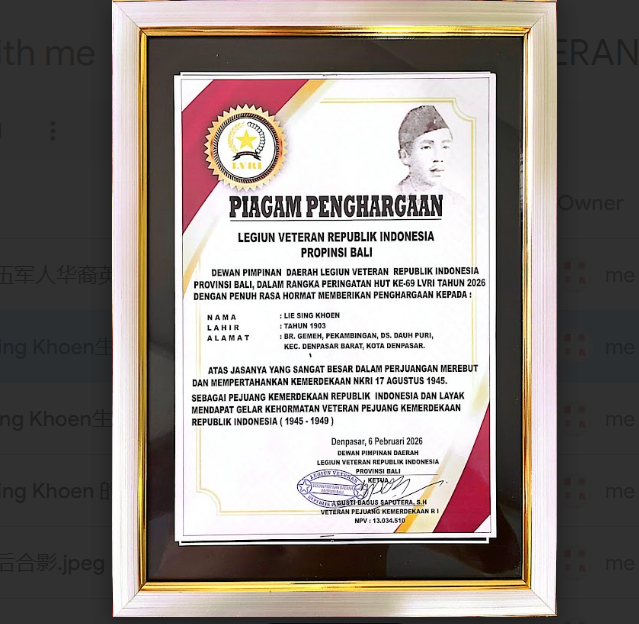 退伍军人协会授予我们已故的祖父Lie Sing Khoen作为