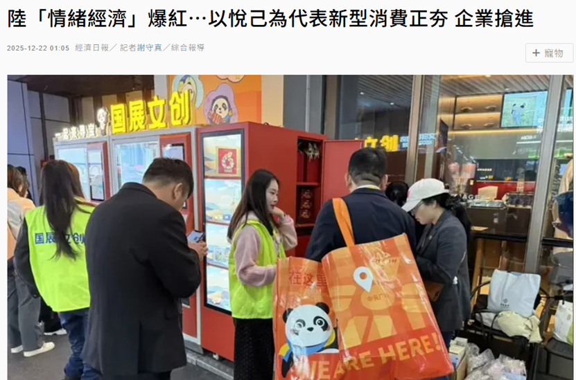 联合新闻网近日发文称,随着中国内地消费市场转向追求精神与情绪价值,“情绪经济”快速崛起,相关消费场景持续扩张;在促消费政策密集推动下,以悦己消费为代表的新型消费,正成为市场与企业布局的重要方向。