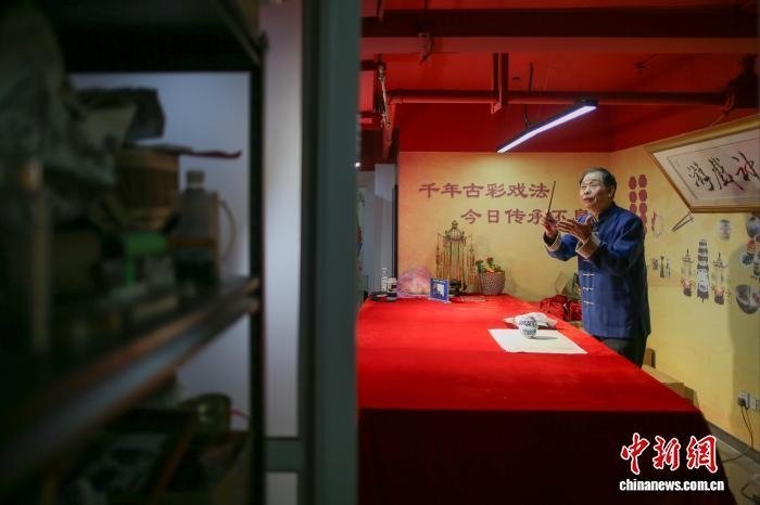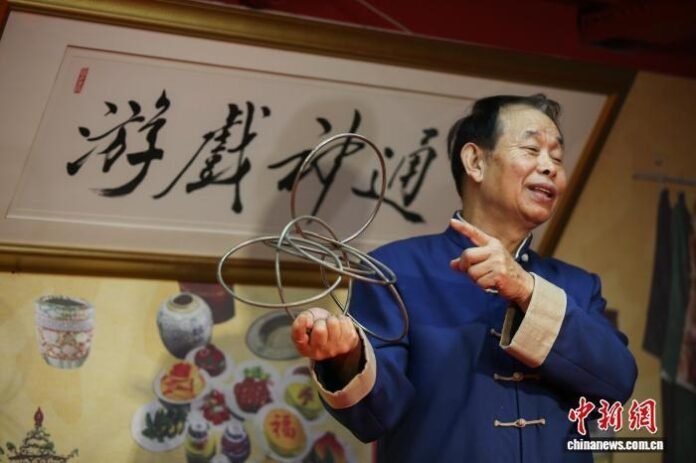 2025年12月26日,肖桂森在其工作室展示传统中国古彩戏法“三仙归洞”。