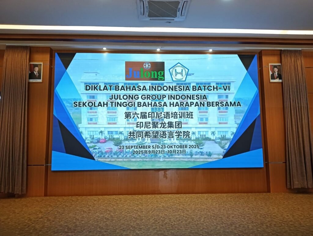 2025年9月23日上午,中国聚龙集团第六届印尼语培训班开幕仪式在共同希望语言学院隆重举行。聚龙集团的领导人张冰、侯光珍、孙忠宝,坤甸办公室代表李小微女士、Willy先生、人资部经理Noris先生、坤甸共同希望教育基金会董事长陈慧珍女士、执行主席刘建源先生、共同希望语言学院院长陈财财老师、副院长张慧云老师、周燕青老师、系主任何利冰老师、培训班21名中国学员及学院师生代表共同出席了本次仪式。