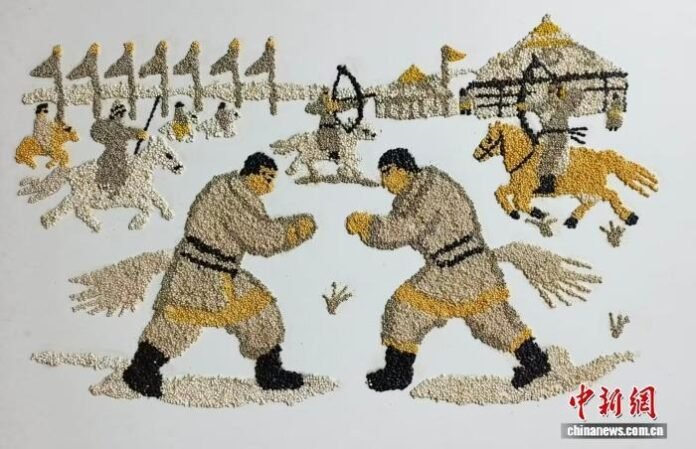 (赤峰讯)初冬时节,走进敖汉小米贴画工作室,仿佛踏入一座用小米构筑的文化殿堂。墙上悬挂的“农耕四季图”上,深浅不一的小米颗粒勾勒出春种的生机、夏耕的繁茂;“京剧脸谱”“梅兰竹菊”等作品中,传统文化艺术的呈现“别具风味”……