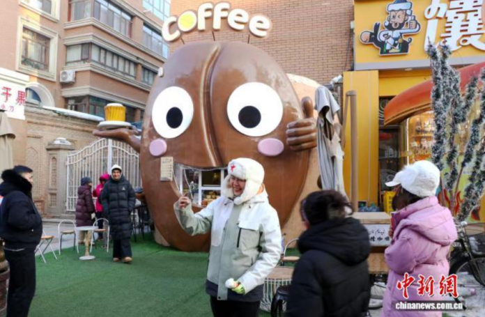 数九寒天,新疆国际大巴扎内游客不减。经营这家“馕咖啡”的“95后”店主古丽米热·阿布里米提忙得热火朝天。