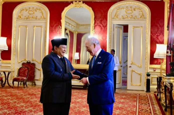 (雅加达)——周三上午,普拉博沃·苏比安托总统在英国伦敦兰开斯特宫门口迎接查尔斯三世国