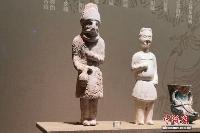 北京大运河博物馆展出的彩绘胡人陶俑(左)和白陶男立俑。