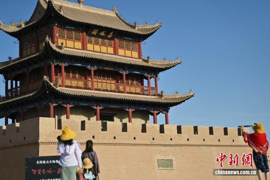 2025年9月23日,甘肃省嘉峪关市嘉峪关关城文物景区内,游人参观拍摄嘉峪关城楼。