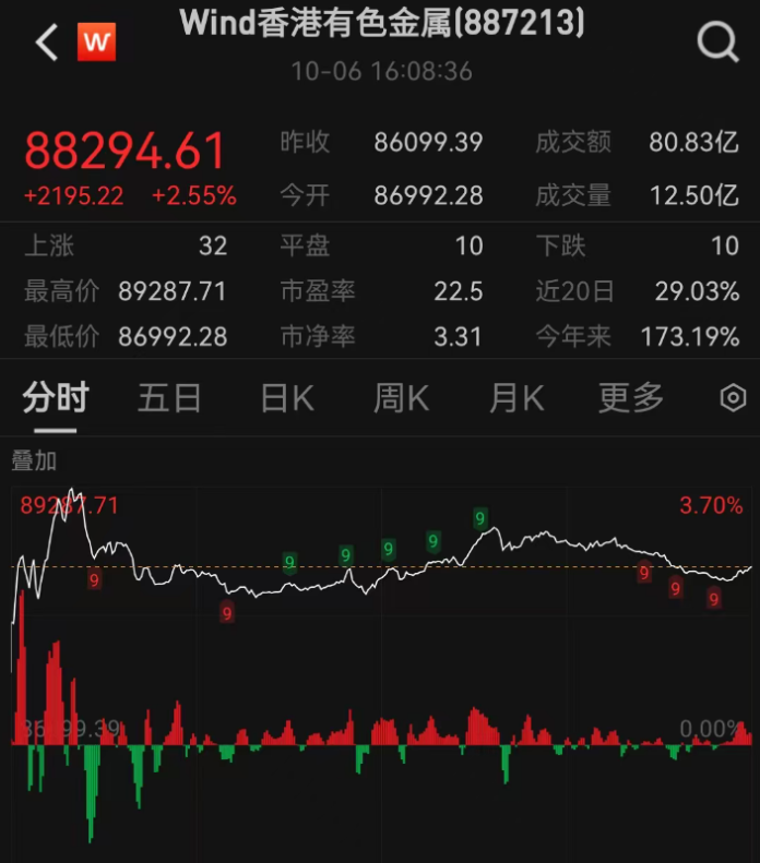 【环球网财经综合报道】港股有色金属板块继续上涨,wind数据显示,10月6日,港股有色金属板块领涨,涨幅为2.55%。其中,坛金矿业涨超40%,胜龙国际、稀镁科技涨超25%。
