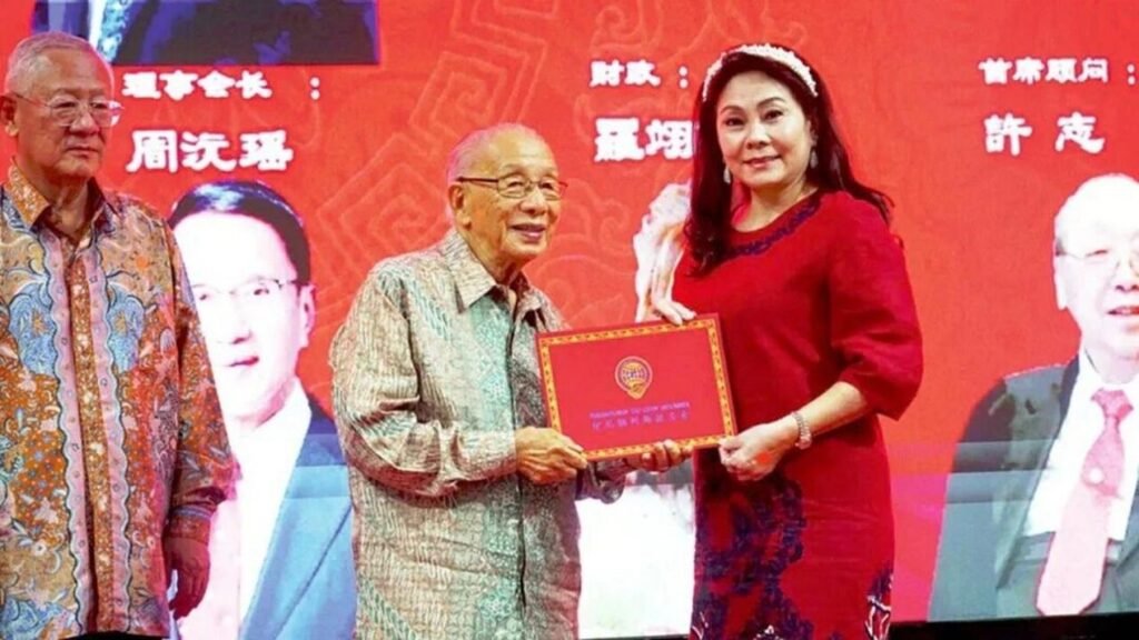 01:印尼潮州乡亲公会代表向百岁元老杨金锋先生颁发荣誉主席证书。曾国奎会长在一旁见证。