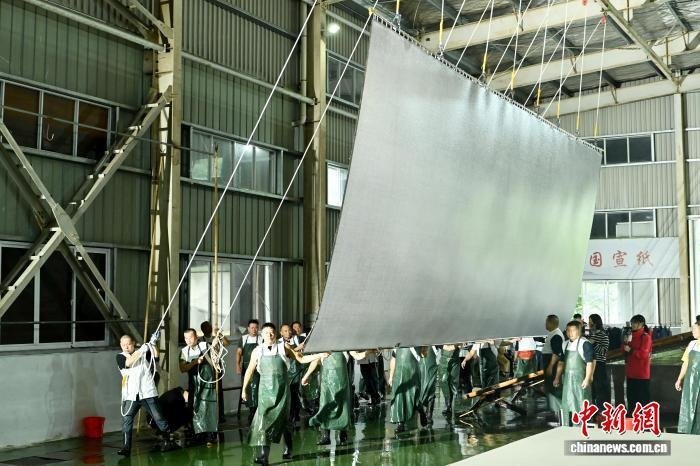 11月8日,在安徽泾县宣纸小镇,近百名制纸工人展示三丈三(长11米、宽3.3米)巨型宣纸的制作过程。