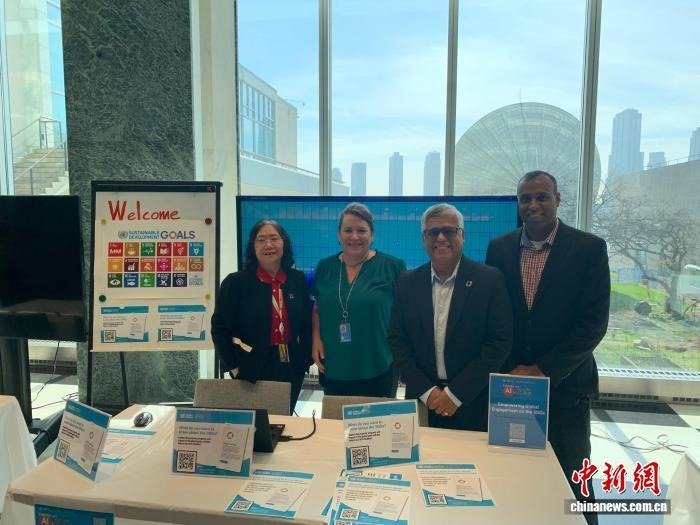 4月22日,王建群(左一)与同事参加联合国秘书处人工智能日活动。