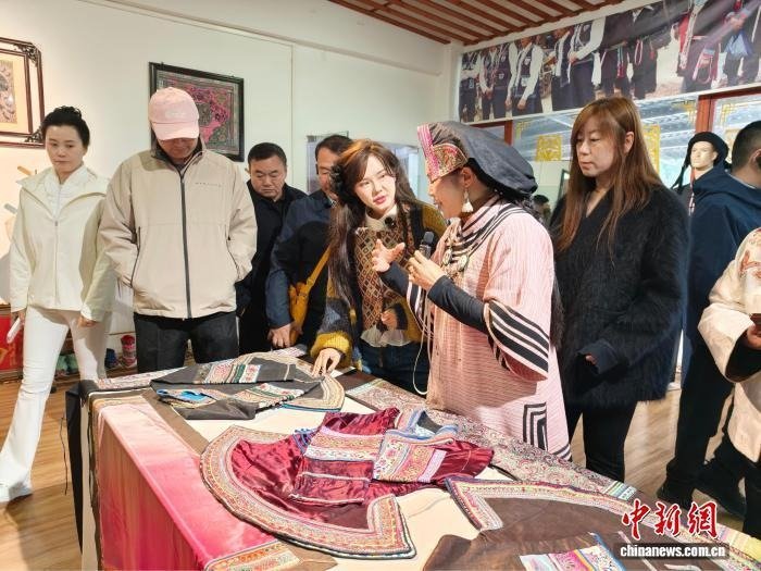 孟聂嘉(右三)了解丘北县民族服饰文化。