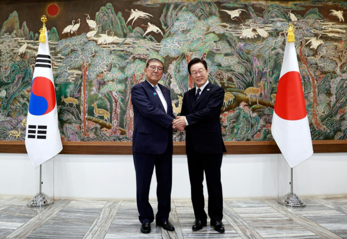 李在明在会谈中提到“正视过去、同时继续面向未来的合作”原则,表示如果两国间不断积累有意义的合作成果,会在有关两国悬而未决议题的对话中产生积极作用。